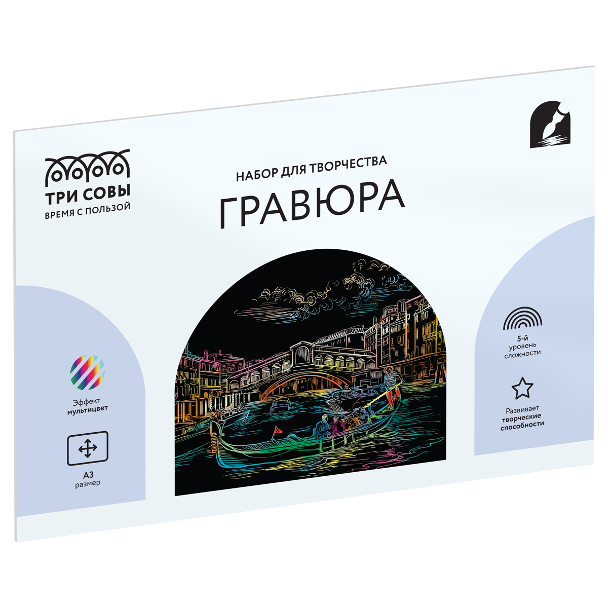 Гравюра «ТРИ СОВЫ» — это увлекательный, популярный, а главное несложный вид творчества, который будет интересен не только детям, но и взрослым. В набор «Венеция» входит мультицветная основа формата А3, штихель и крепление на стену.