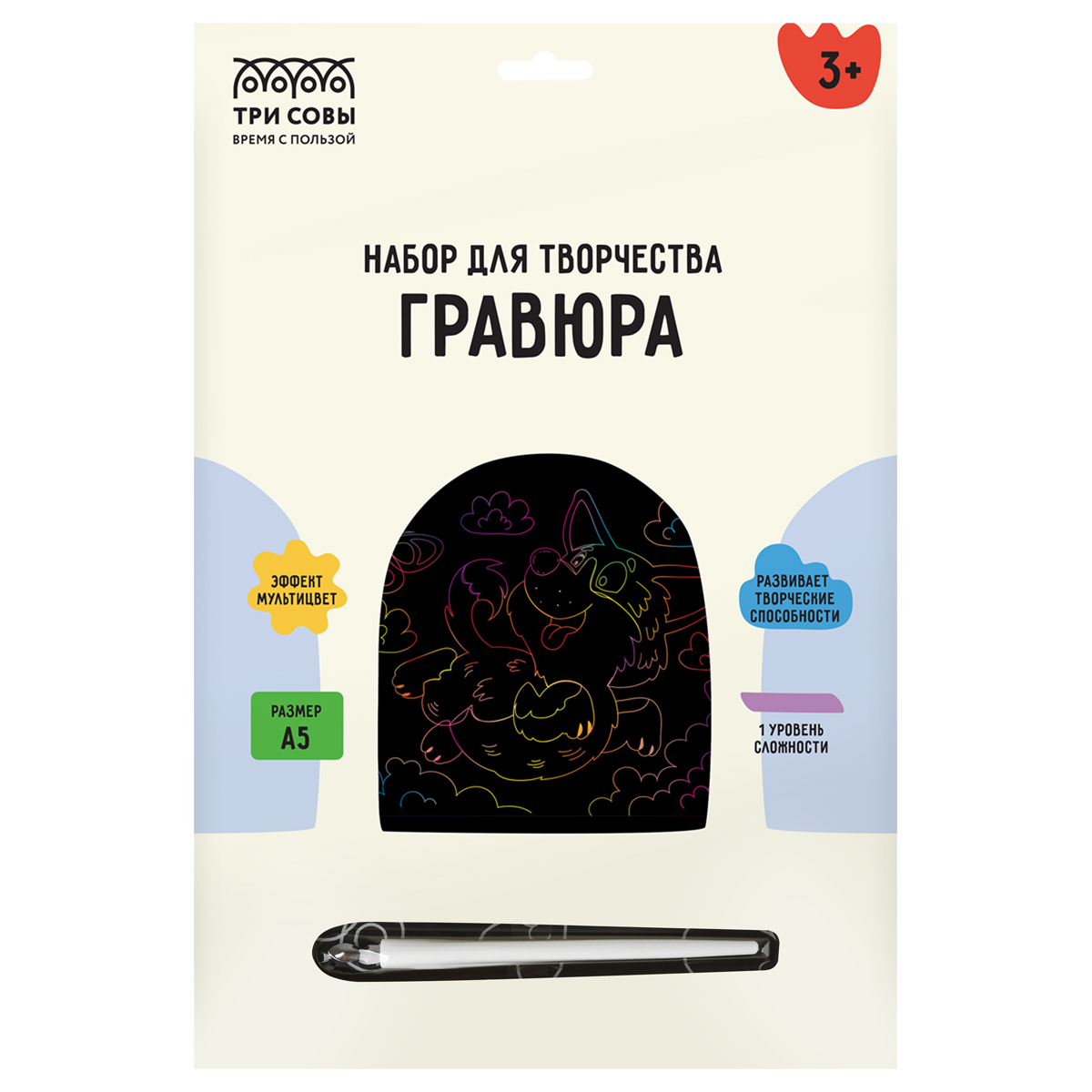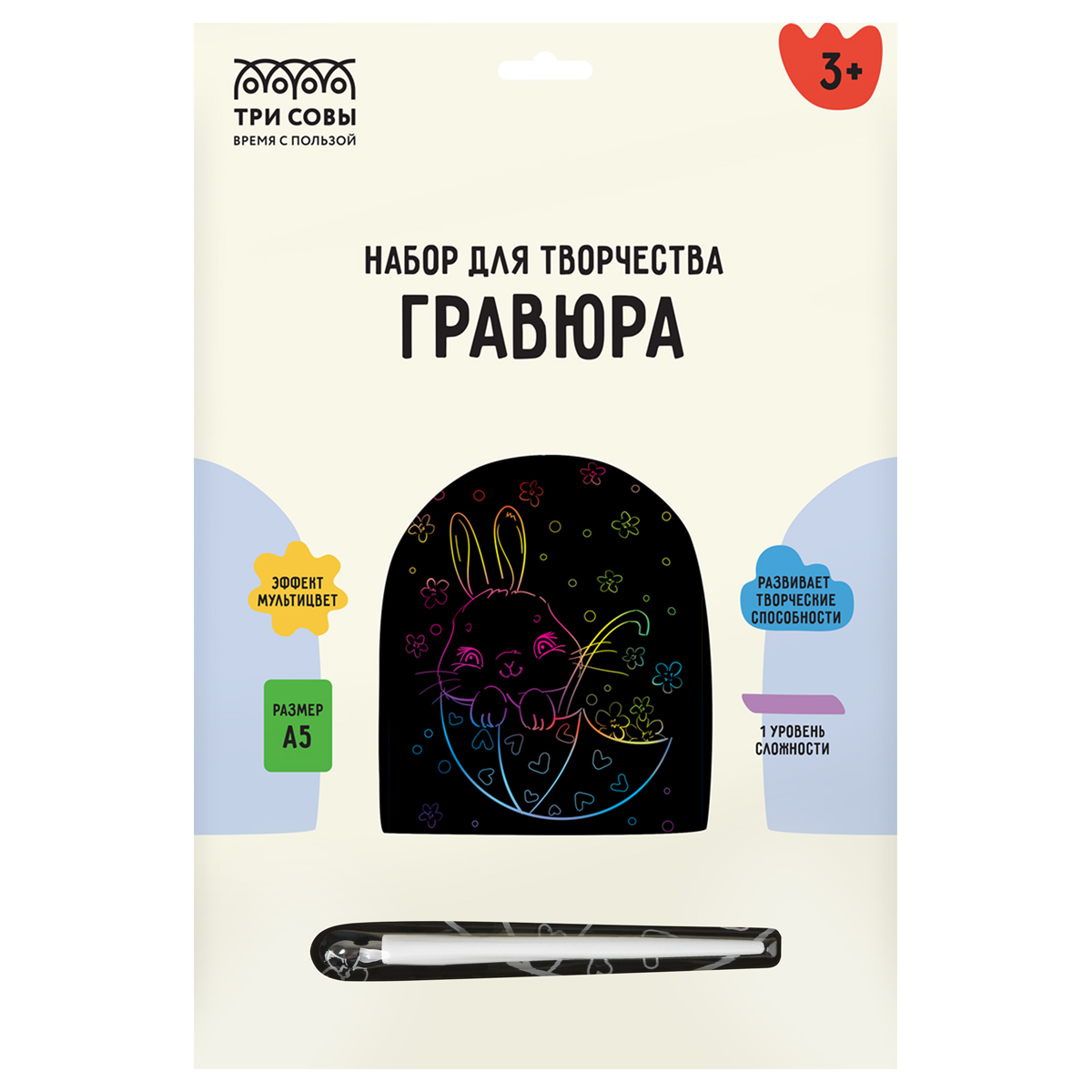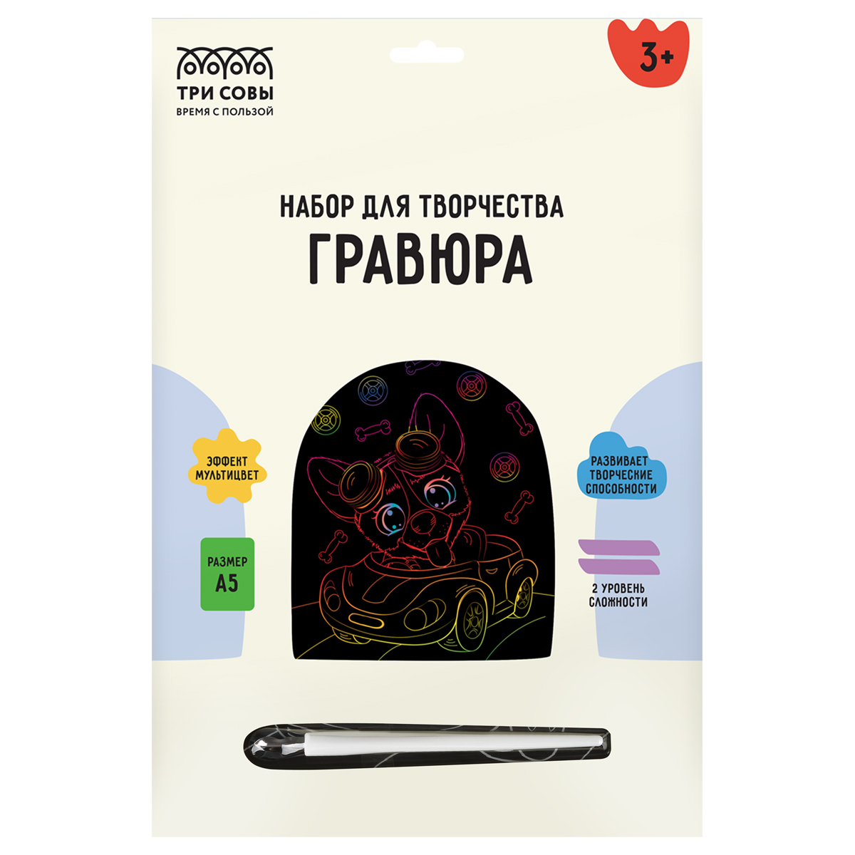 Набор гравюр «ТРИ СОВЫ» — это увлекательный, популярный, а главное несложный вид творчества, который будет интересен не только детям, но и взрослым. В набор MIX6 входят основы с эффектом мультицвета, формата А5, штихель и крепление на стену.
