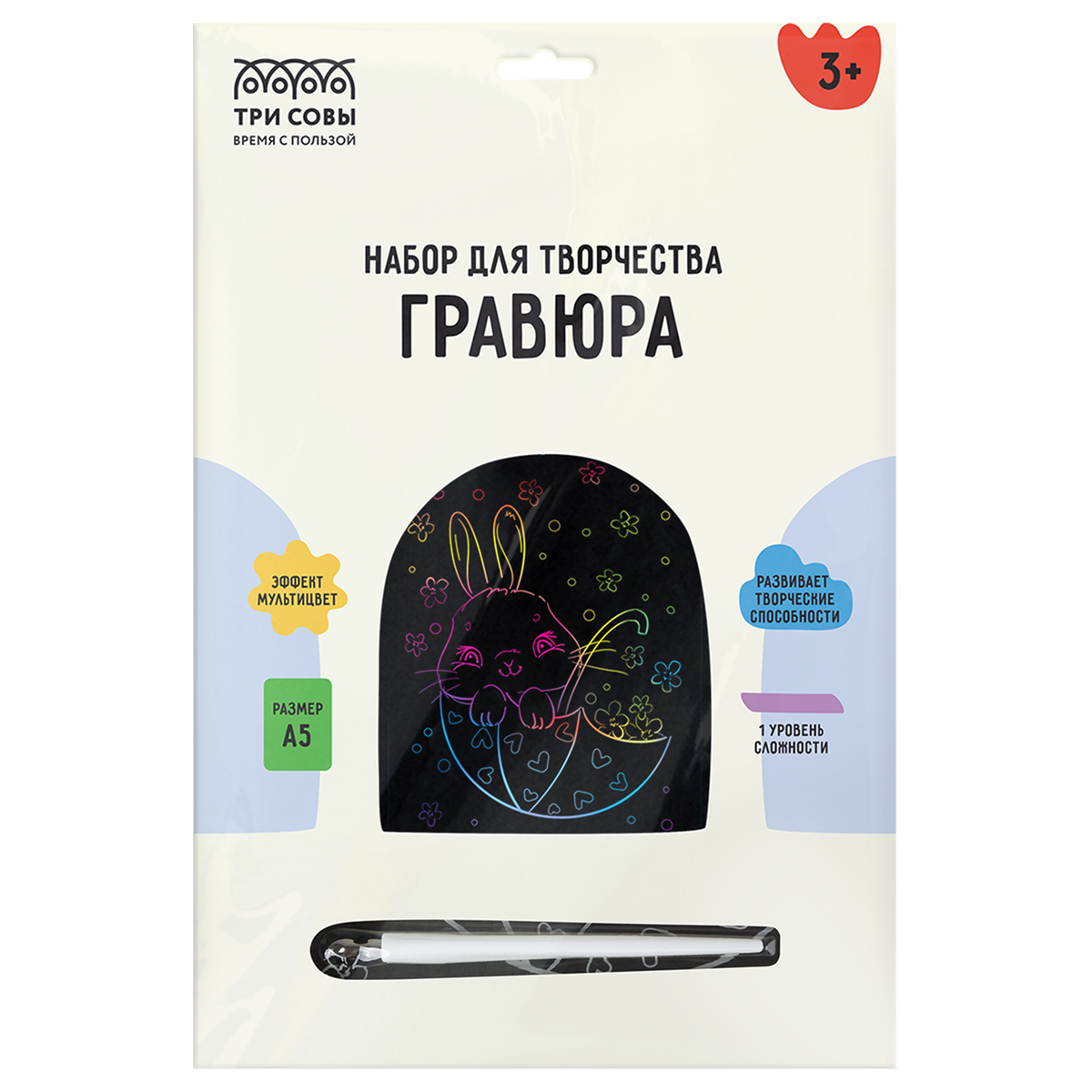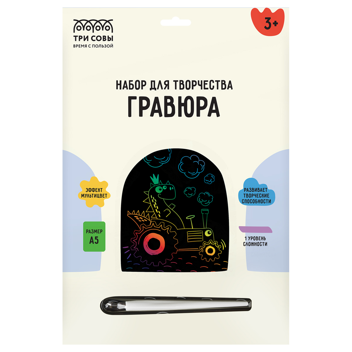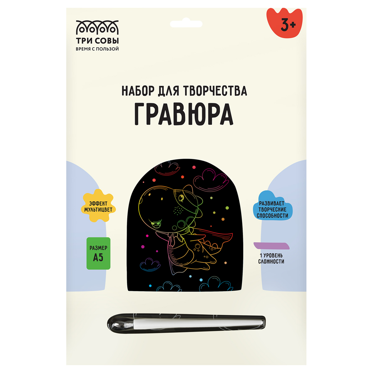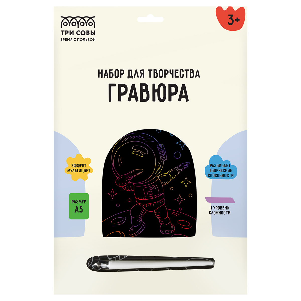 Набор гравюр «ТРИ СОВЫ» — это увлекательный, популярный, а главное несложный вид творчества, который будет интересен не только детям, но и взрослым. В набор MIX6 входят основы с эффектом мультицвета, формата А5, штихель и крепление на стену. <br/>Работа над гравюрой развивает творческие способности, внимательность, а также помогает избавиться от напряжения и снять стресс. <br/>Интересные современные дизайны отлично впишутся в интерьер дома. <br/>Набор упакован в термоусадочную пленку.<br/>ВНИМАНИЕ! Товар не предназначен для детей в возрасте до 3-х лет. Набор содержит острый предмет. Использовать только под присмотром взрослых.<br/><br/>«ТРИ СОВЫ» – время с пользой!<br/><br/>• Размер: А5;<br/>• Эффект: мультицвет.