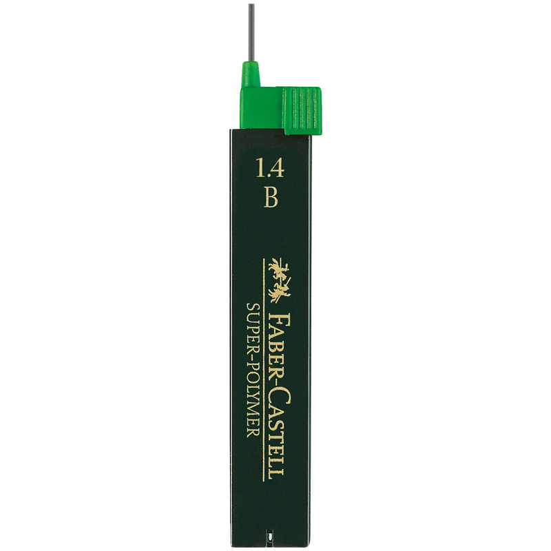 Особо прочные суперполимерные грифели для механических карандашей от немецкого производителя Faber-Castell серии Super-Polymer. Упакованы по 12 штук в удобный пластиковый футляр, препятствующий поломке грифелей. Диаметр грифеля – 1.4 мм, длина грифеля – 60 мм, твёрдость – B. Грифели оставляют линии насыщенного графитового цвета.
