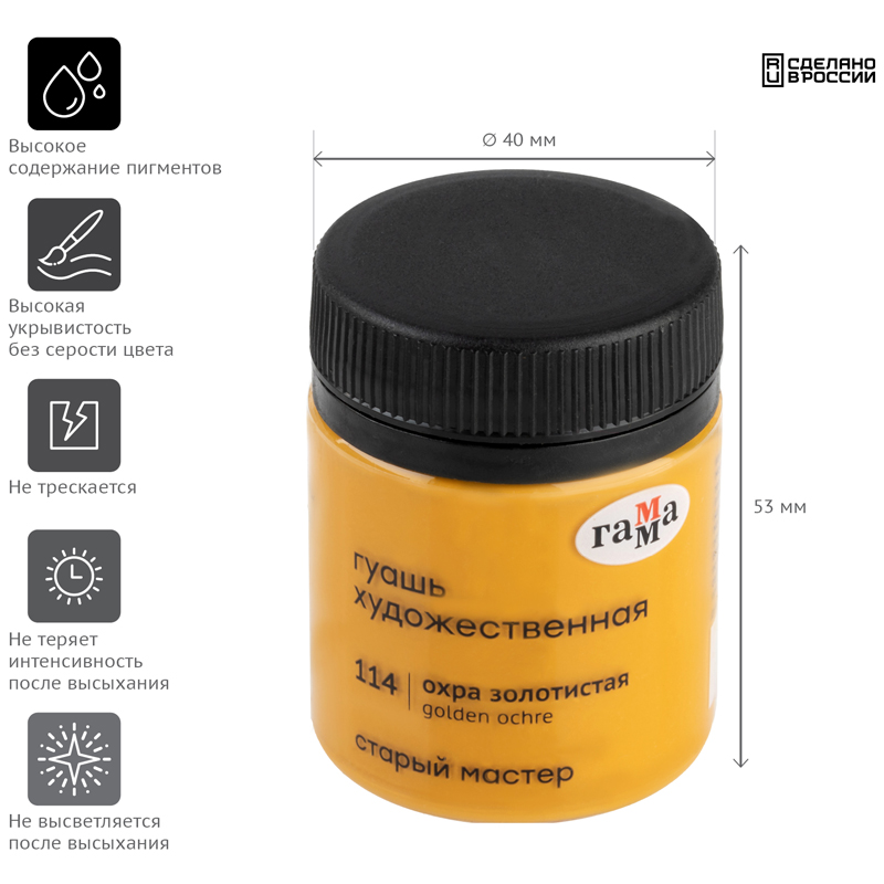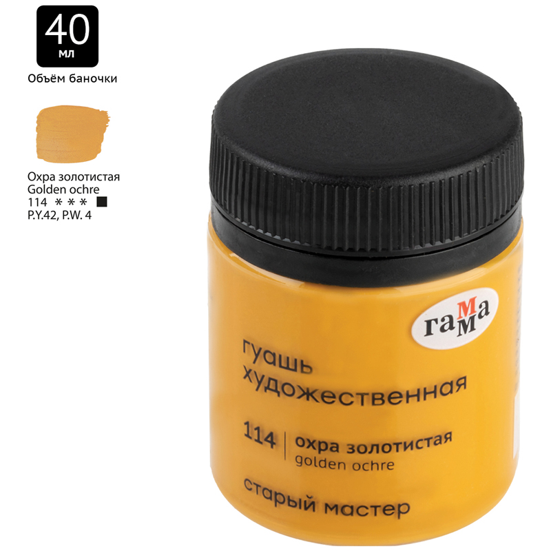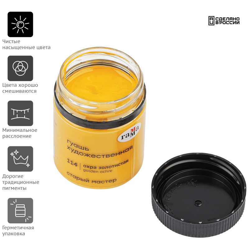 Гуашь художественная "Гамма" серии "Старый мастер" имеет уникальную рецептуру, разработанную в собственной исследовательской лаборатории завода совместно с художниками. Краски изготавливается из тонкодиспесных пигментов, связующего, в состав которого входит раствор растительного клея - гуммиарабика высшей степени очистки. Краска легко наносится на поверхность, благодаря специальным добавкам сохраняет яркость цвета после высыхания, создавая плотный бархатистый слой. Гуашь обладает высокой укрывистостью, отличной разносимостью, а также хорошо смешивается между собой. Большая часть цветов имеет самый высокий показатель светостойкости.