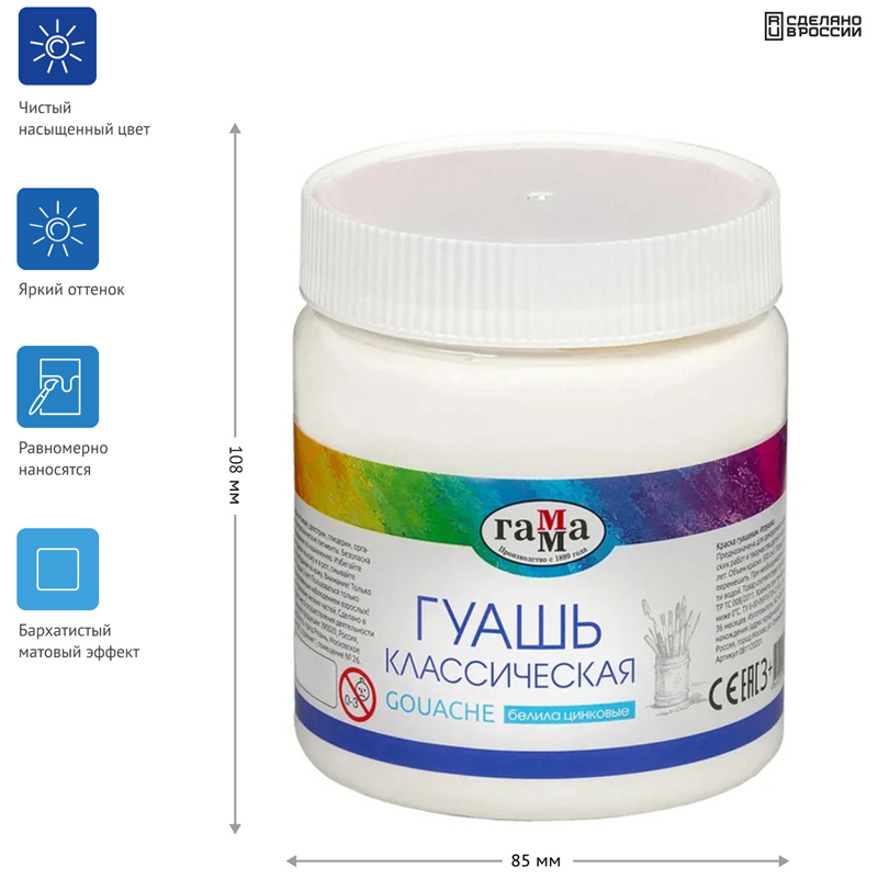 Штучная гуашь объёмом 500 мл серии «Классическая» белила цинковые предназначена для творческих занятий в школе и дома. Благодаря удобной герметичной баночке с завинчивающейся крышкой краска долго хранится, не высыхая.
