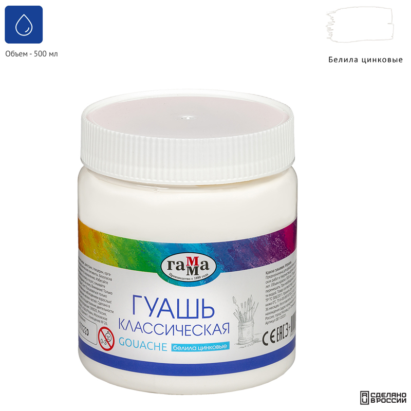 Штучная гуашь объёмом 500 мл серии «Классическая» белила цинковые предназначена для творческих занятий в школе и дома. Благодаря удобной герметичной баночке с завинчивающейся крышкой краска долго хранится, не высыхая.<br/>Детская гуашь разработана на основе качественного прозрачного связующего вещества, которое обеспечивает чистоту цветов. Краски плотные, укрывистые, хорошо смешиваются, равномерно наносятся практически на любую основу. При высыхании создают плотный красочный слой с бархатистым эффектом. Гуашь идеально подходит для групповых занятий в детских садах и школах, а также для тех, кто много рисует. Большого объёма краски хватит на целый класс. <br/>• Цвет: белила цинковые;<br/>• Упаковка: баночка с завинчивающейся крышкой;<br/>• Объём баночки: 500 мл.