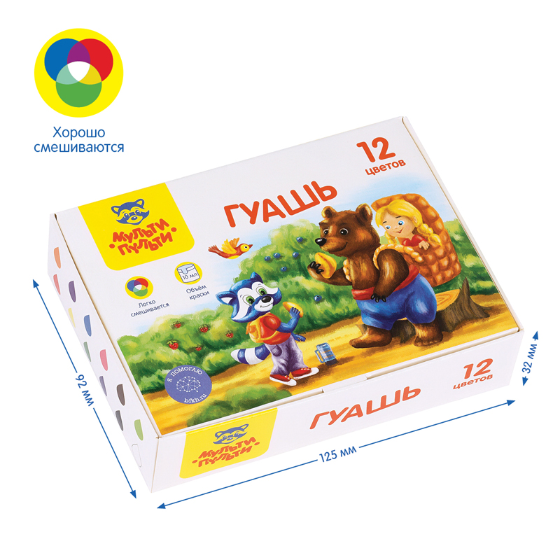 Гуашь «Мульти-Пульти» серии «Енот в сказке» создана специально для детского творчества и декоративно-оформительских работ. Краски подходят для рисования по бумаге, картону, дереву, стеклу, керамике. Для детей старше 3-х лет. В наборе имеются 12 баночек разных цветов: оранжевый, фиолетовый, голубой, розовый, коричневый, светло-зеленый, красный, желтый, зеленый, синий, черный, белый. Объем каждой баночки с завинчивающейся крышкой - 10 мл, общий объем - 120 мл.