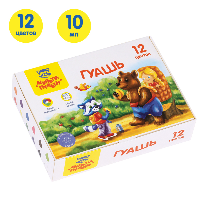 Гуашь «Мульти-Пульти» серии «Енот в сказке» создана специально для детского творчества и декоративно-оформительских работ. Краски подходят для рисования по бумаге, картону, дереву, стеклу, керамике. Для детей старше 3-х лет. В наборе имеются 12 баночек разных цветов: оранжевый, фиолетовый, голубой, розовый, коричневый, светло-зеленый, красный, желтый, зеленый, синий, черный, белый. Объем каждой баночки с завинчивающейся крышкой - 10 мл, общий объем - 120 мл. <br/>Гуашь имеет яркие насыщенные цвета, обладает хорошей кроющей способностью и хорошо разносится по бумаге.<br/>• Количество цветов: 12;<br/>• Упаковка: пластиковая баночка с завинчивающейся крышкой;<br/>• Объем баночки: 10 мл.