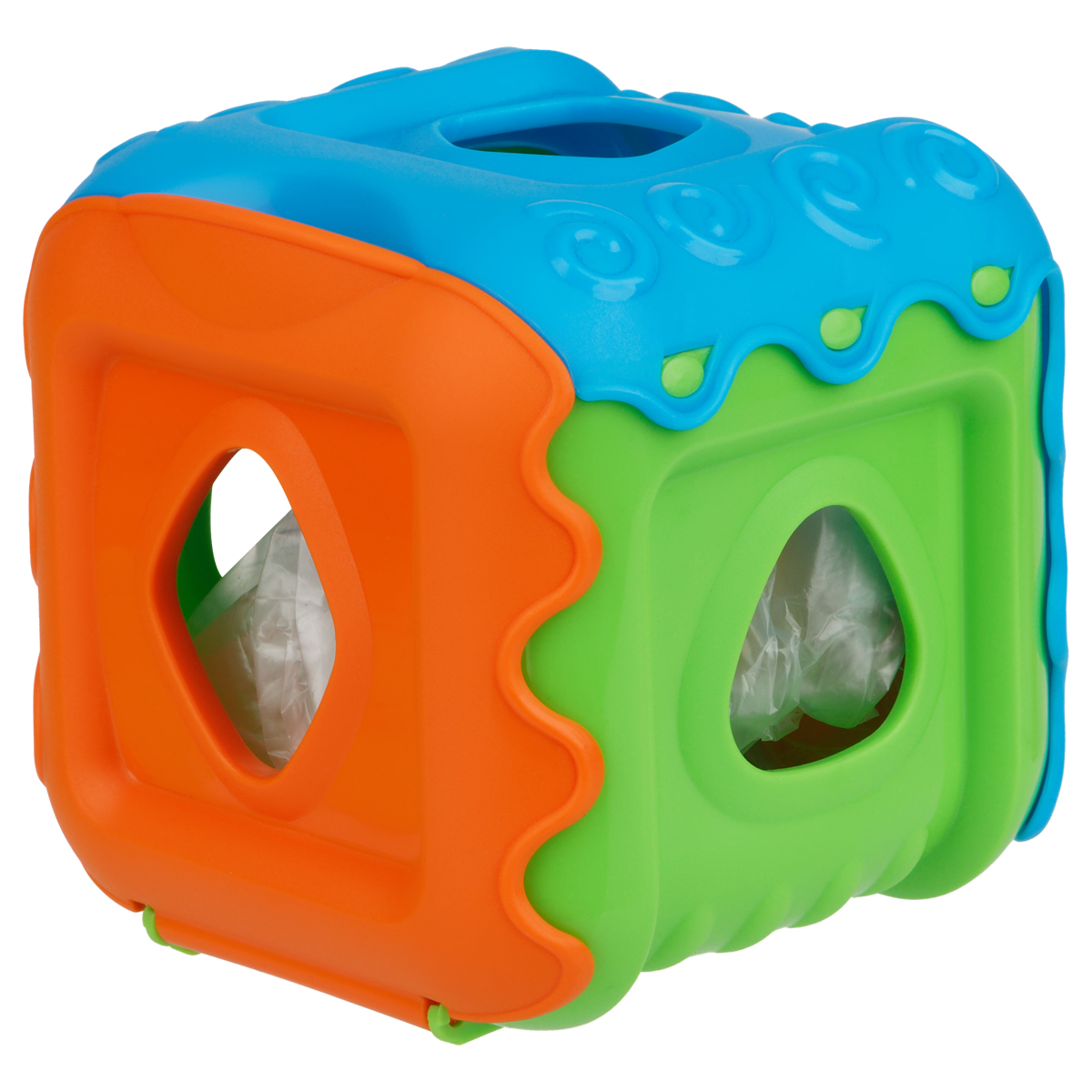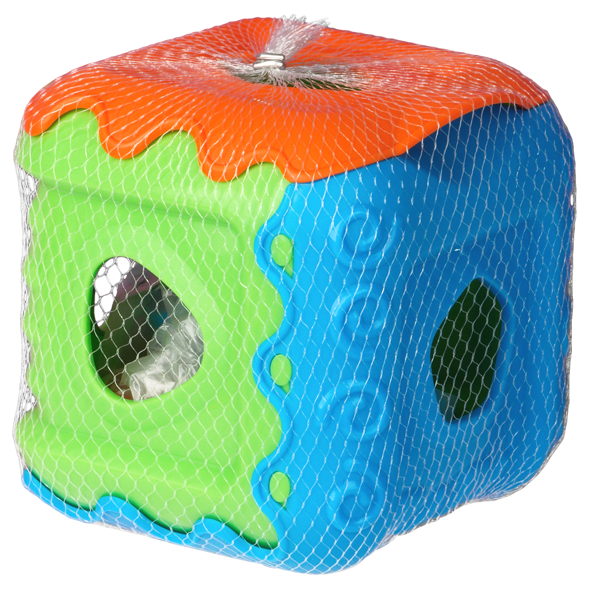 Игрушка выполнена в форме кубика, на каждой стороне которого проделаны отверстия различной формы.