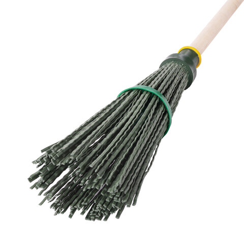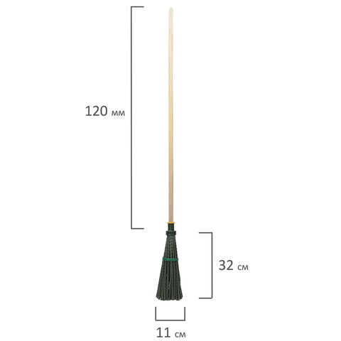 Круглое строение метлы позволяет производить подметание диаметром захвата в 11 см. Оснащена полипропиленовыми прутьями толщиной 0,2 мм, поэтому износоустойчива и легко моется. Поставляется с березовым черенком длиной 120 см. Размер рабочей части - 32х11 см. Вес - 0,97 кг.