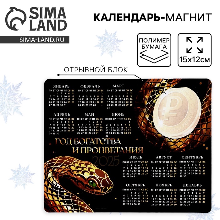 Магнит календарь 2025 с блоком «Год богатства и процветания», , 15 х 12 см