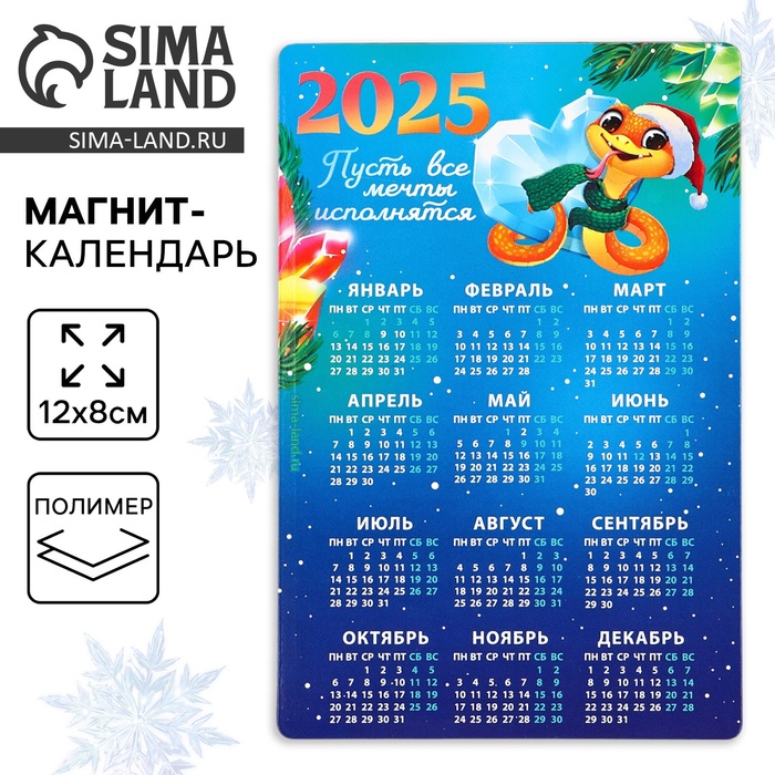 Магнит календарь 2025 новогодний «Пусть все мечты исполнятся», , 12 х 8 см