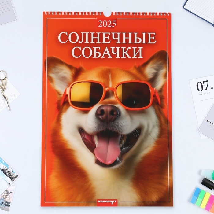 Календарь перекидной на ригеле А3 "Солнечные собачки" 2025, 32 х 48 см