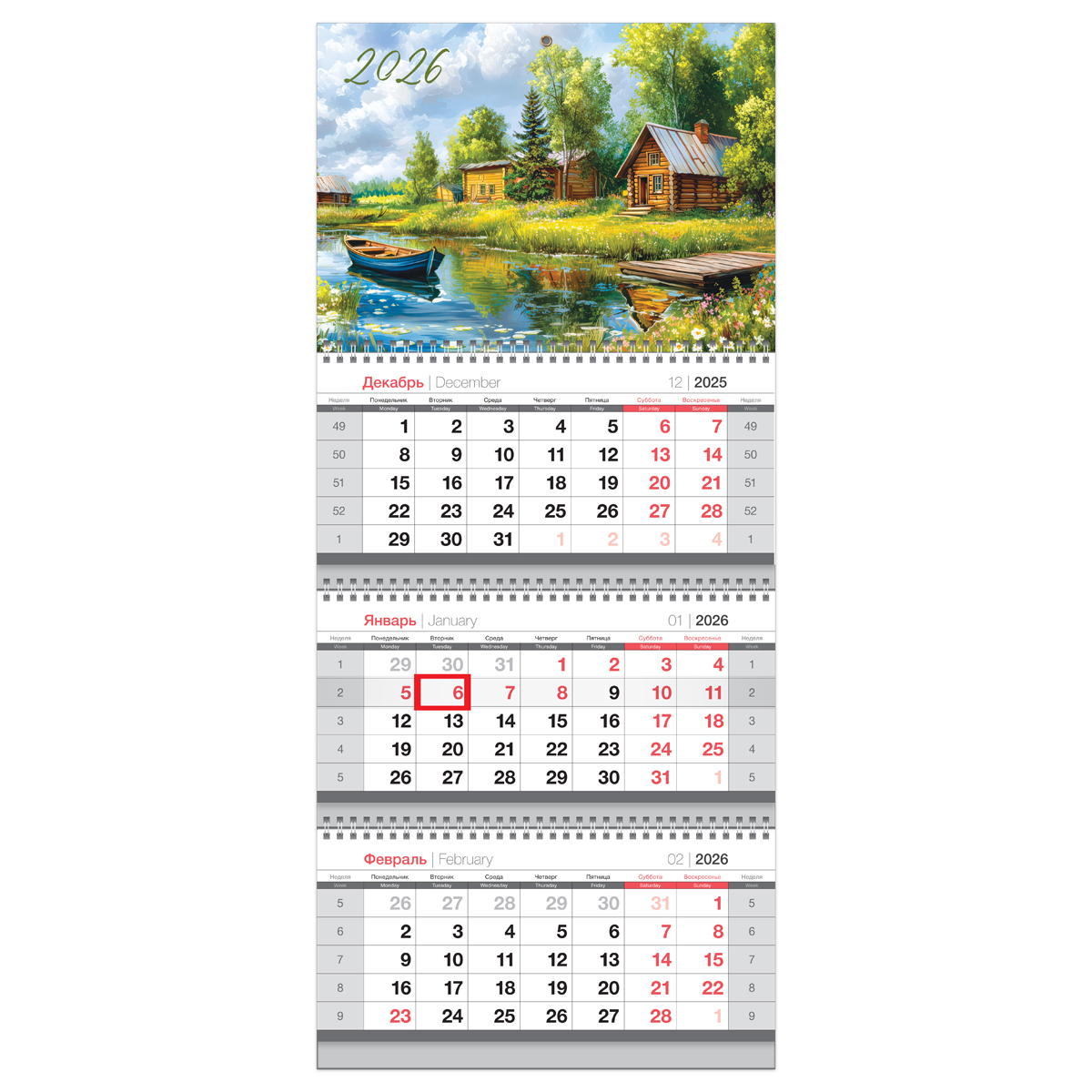 Календарь квартальный 3 бл. на 3 гр., 195*445 мм BG Mini "Деревня", с бегунком, 2026г.