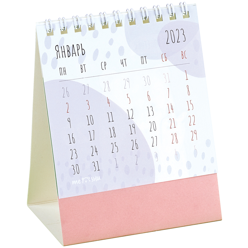 Календарь-домик MESHU настольный перекидной на 2023 поможет планировать день, назначать встречи, помнить о праздничных датах. Ультрасовременный дизайн и компактный размер 100*130 мм.<br/><br/>Календарь имеет подложку с рисунком и 7 листов с календарной сеткой где каждая страница содержит привлекательное, красочное изображение с удобной календарной сеткой.<br/> <br/>Материал блока – мелованная бумага. Цветность – полноцветная. Нижняя подложка выполнена из картона плотностью 320 г/м2. Цветность – 4 краски.<br/><br/>• Размер: 100*130 мм;<br/>• Кол-во гребней: 1;<br/>• Ориентация: вертикальная.