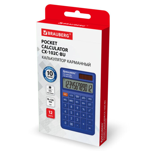 Калькулятор карманный BRAUBERG CX-102C-BL (76x126мм), 12 разрядов, двойное питание, ГОЛУБОЙ, 272649
