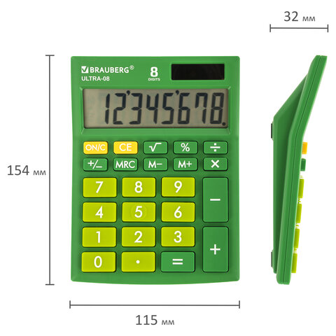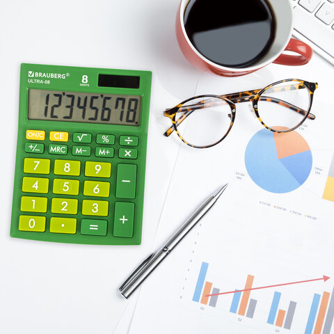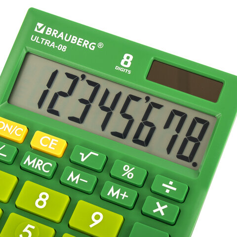 Настольный калькулятор BRAUBERG ULTRA-08-GN. Большой яркий дисплей, устойчивый корпус с прорезиненными ножками и крупная клавиатура с цветной дифференциацией позволяют работать эффективнее с максимальным комфортом.