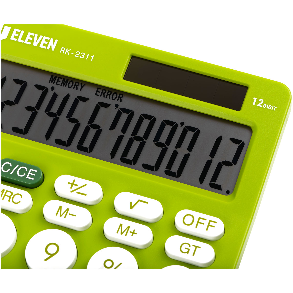 Уценка. Ограничений в дальнейшем использовании нет. Повреждения товара нет.<br/>Причина уценки: дополнительная этикетка на корпусе<br/><br/><br/>12-ти разрядный настольный калькулятор Eleven RK-2311-GN предназначен для выполнения арифметических операций. Размер калькулятора – 143*192*26 мм, вес – 188,6 г, цвет – салатовый. Незаменимый помощник в офисе, школе и дома. Оптимальный набор функций поможет автоматизировать расчёты: коррекция последнего введенного значения, расчёт наценки, кнопка «00», функция итогового суммирования. Двойное питание (солнечная батарея + батарея LR1130) и автоматическое отключение увеличивают срок службы. Упакован в картонную коробку. Гарантия – 5 лет.<br/>• Разрядность: 12;<br/>• Тип питания – двойное (солнечная батарея/батарейка LR1130);<br/>• Клавиша «00».<br/><br/>Уцененный товар подлежит возврату или обмену в случае обнаружения недостатков, о которых покупатель не был проинформирован перед покупкой