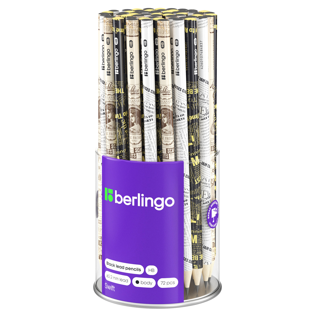 Чернографитный карандаш из липы, с заточкой. Подходит для черчения и рисования. Диаметр грифеля 2,2мм, твердость HB, круглая форма, штрих-код на корпусе. Цветная печать на корпусе - 2 дизайна ассорти. Упаковка в тубу по 72шт.