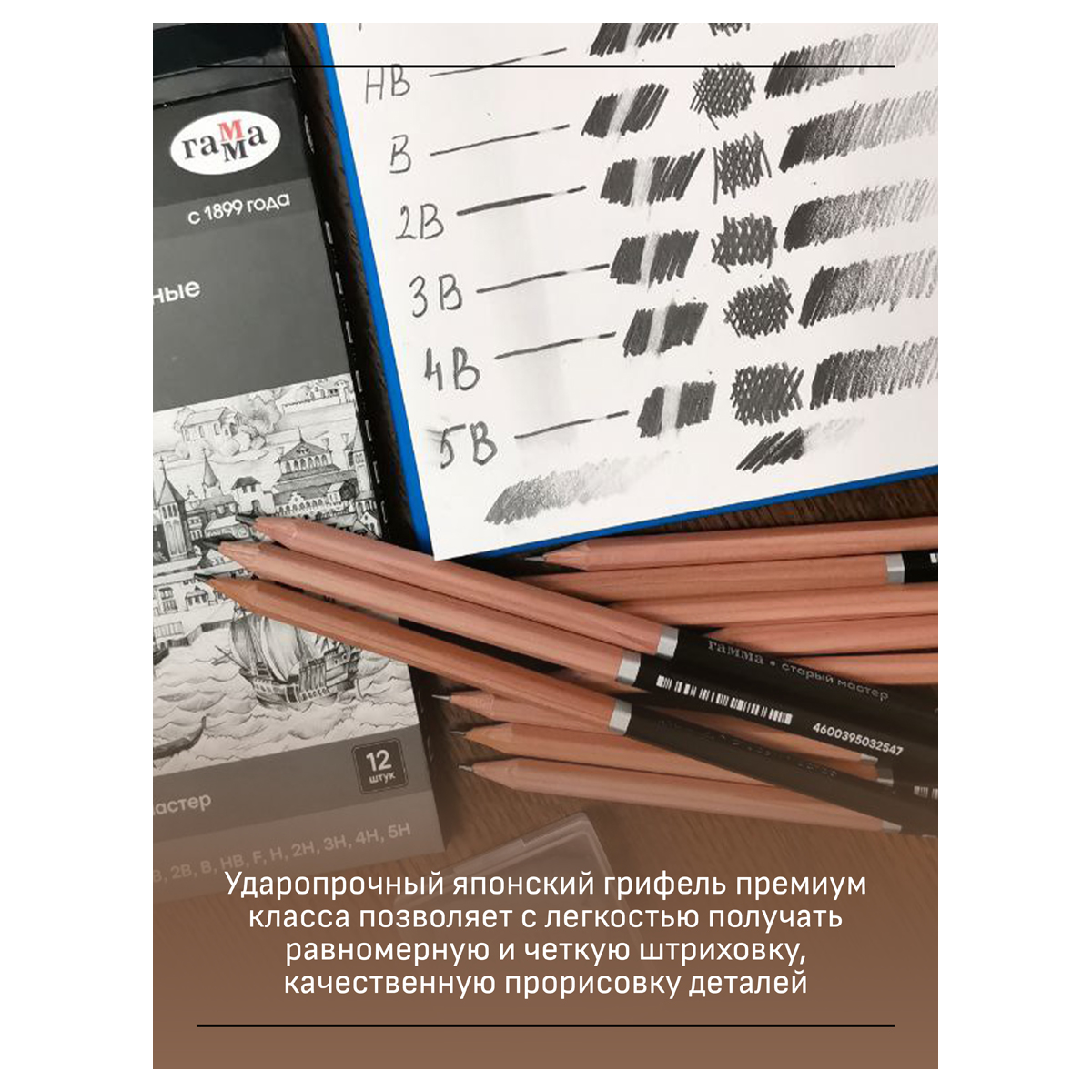 Чернографитные карандаши ГАММА серии «Старый мастер» твёрдостью 2B предназначены для рисования, скетчинга и черчения на бумаге и картоне. Диаметр грифеля – 2,15 мм. Карандаши «Старый мастер» выпускаются в 20 различных степенях твердости: от 8H до 10B, поэтому идеально подойдут как для художников, иллюстраторов, так и для архитекторов и инженеров. Карандаши упакованы в картонную коробку по 12 штук. <br/>В карандашах ГАММА используется японский грифель премиум-класса, который позволяет с легкостью получать равномерную и четкую штриховку, качественную прорисовку деталей. Разные степени твердости помогают с легкостью передать темные, средние и светлые тона, варьировать толщину линии. Благодаря специальной равномерной проклейке грифеля в несколько этапов карандаши не крошатся и не ломаются даже после падения.<br/>Карандаши ГАММА изготовлены из высококачественной натуральной древесины кедра. Это мягкая, но прочная древесина, долговечная и водонепроницаемая. Благодаря этому карандаши затачиваются легко без зазубрин и заноз. Корпус эргономичной шестигранной формы с приятным матовым покрытием комфортно держать в руке. Длина корпуса – 177 мм, а диаметр – 7 мм. <br/>• Твёрдость: 2B;<br/>• Диаметр грифеля: 2,15 мм;<br/>• Материал корпуса: дерево;<br/>• Форма корпуса: шестигранная