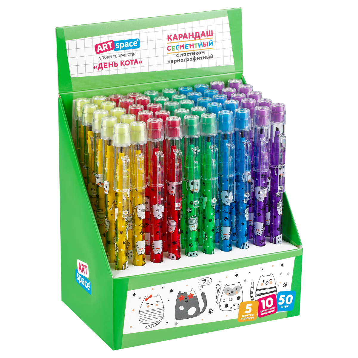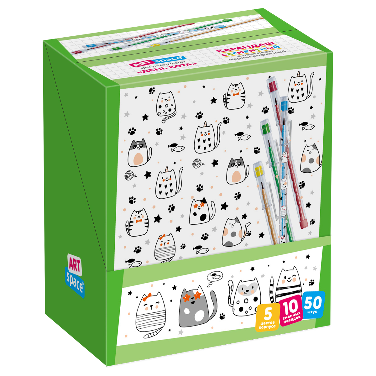 Карандаш чернографитный сегментный ArtSpace «День кота» удобен для школьников, особенно младших классов. Сегмент можно быстро заменить на новый. Пластиковый корпус круглой формы диаметром 0,8 см и длиной 14 см дополнен яркими изображениями. Степень твердости НВ (твердо-мягкий). На колпачке есть ластик. В красочном дисплей-боксе 50 штук пяти различных цветов корпуса.<br/>• Тип: чернографитный;<br/>• Заточка грифеля: да.<br/>• Количество карандашей в упаковке: 50 штук.