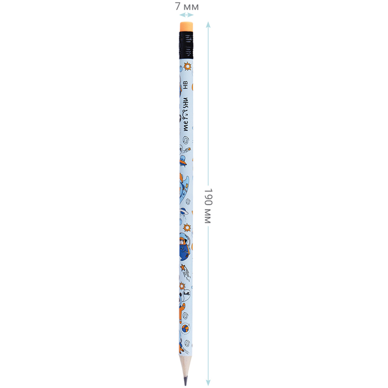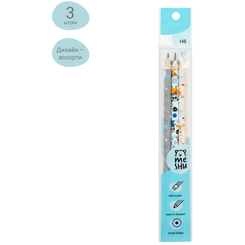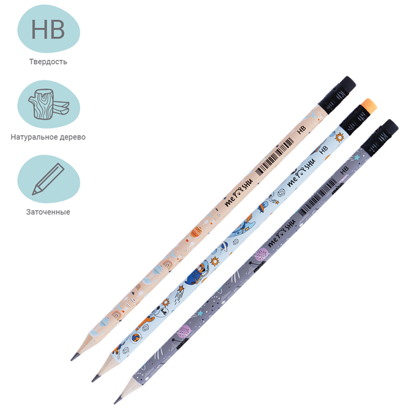 Набор чернографитных карандашей MESHU с печатью на корпусе и ластиком станет лучшим помощником в школе или офисе. Карандаши представлены в круглом корпусе в трёх разных дизайнах и упакованы в пакет с европодвесом. Твердость грифеля – HB, диаметр – 2,2 мм, длина карандаша – 190 мм. Изготовлены из светлого дерева. В наборе 3 карандаша. <br/>Забавные дизайны серии Space в космической тематике понравятся всем любителям яркой канцелярии, которая привлекает внимание. Карандаши легко затачиваются и идеально подойдут для черчения и рисования. Письмо с карандашами MESHU мягкое и уверенное. Они заточены и уже готовы к работе. <br/>• Диаметр грифеля: 2,2 мм;<br/>• Твердость: HB;<br/>• Заточенный грифель: да;<br/>• Форма корпуса: круглая;<br/>• Наличие ластика: да;<br/>• Цвет дерева: светлый;<br/>• Цвет корпуса: ассорти;<br/>• Количество штук в упаковке: 3;<br/>• Тип упаковки: пакет с европодвесом.