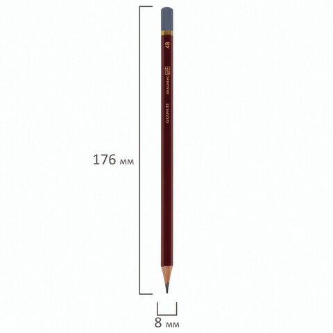Карандаш легко затачивается, максимально устойчив к повреждениям. Изготовлен из дерева высокого качества. Имеет шестигранное сечение. Карандаш длиной 176 мм обладает степенью твердости – 4B. Цвет корпуса - бордовый. Диаметр грифеля- 2,4 мм. Поставляется заточенным.