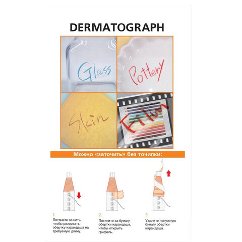 Уникальный восковой карандаш Uni Mitsubishi Dermatograph (Мицубиси Дэрматограф), который не требует заточки! Этот карандаш можно отнести к промышленным инструментам, так как он пишет практически на всех видах поверхностей: стекло, металл, керамика, пластик и кожа. Карандаш Uni Mitsubishi Dermatograph имеет широкую область применения: для маркировки изделий, нанесения разметки, подписей, декорирования посуду, нанесения узоров и прочее. При температуре +40 С грифель расплавляется.