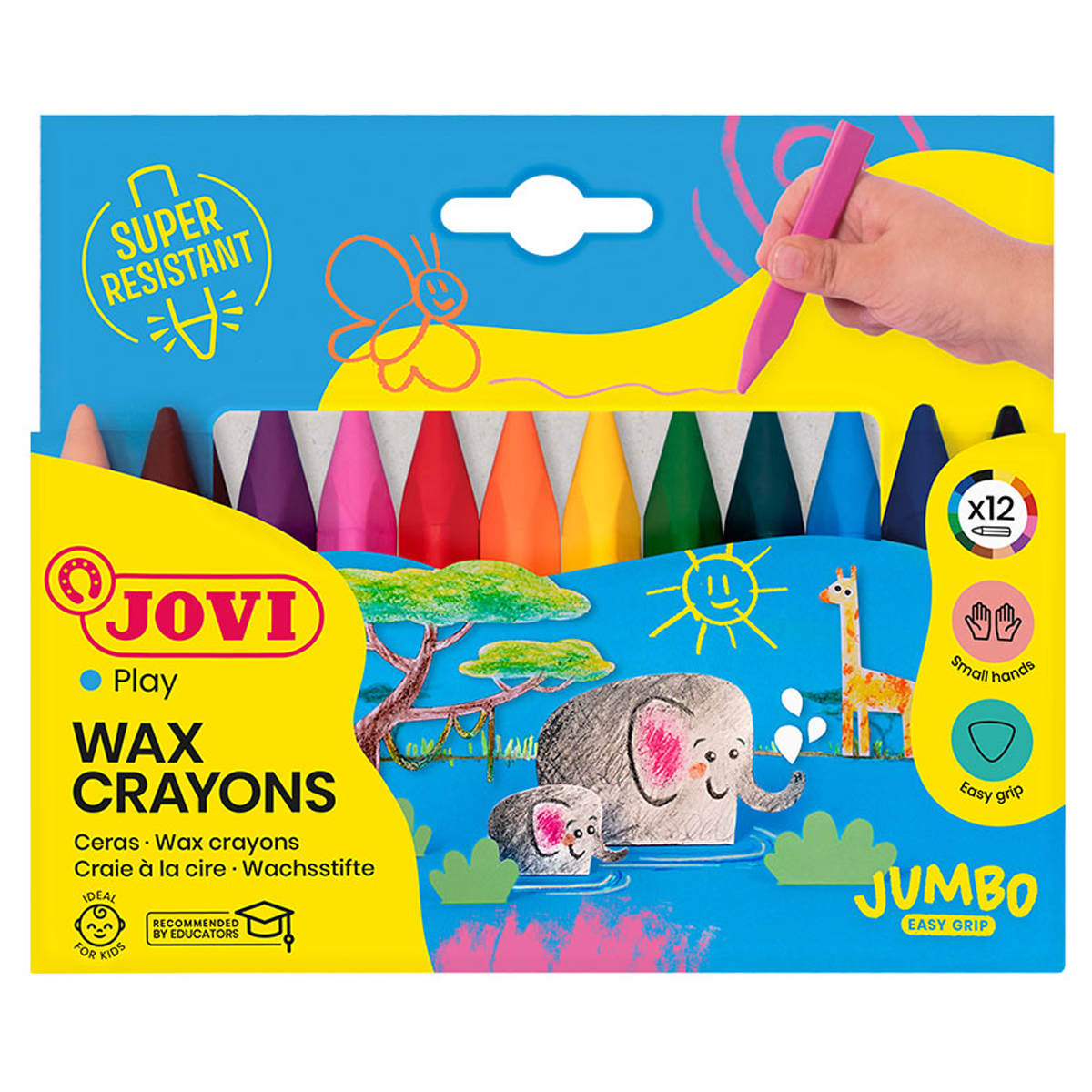 Специальные трёхгранные восковые мелки JOVI сертифицированы для детей старше трёх лет. Толщина мелка составляет 11 мм, а длина — 82 мм. В наборе 12 ярких цветов: жёлтый, красный, синий, зелёный, телесный, голубой, фиолетовый, оранжевый, розовый, тёмно-зелёный, коричневый, чёрный. Мелки также идеально подходят для детей, которые тренируют свои навыки рисования и учатся правильно держать карандаш в руке. Треугольные мелки идеальны для тренировки руки к письму у дошкольников и детей младшего школьного возраста. Эта форма эргономична, тренирует навык правильного захвата, снижает нагрузку на кисти рук. Подходят для рисования на бумаге, картоне и любой шероховатой поверхности. Мелки не пачкают руки, не липнут, не имеют запаха, не ломаются при падении, могут стираться ластиком. Мелки могут использоваться очень долго, так как полностью состоят из пишущего стержня. Изготавливаются из натуральных растительных компонентов: натуральный воск, естественные пищевые красители. Не содержат глютен и основные аллергенные компоненты. Упакованы в картонную коробку с европодвесом. Страна производства Испания.