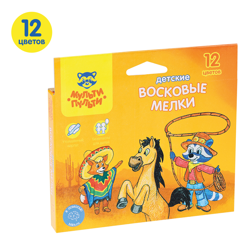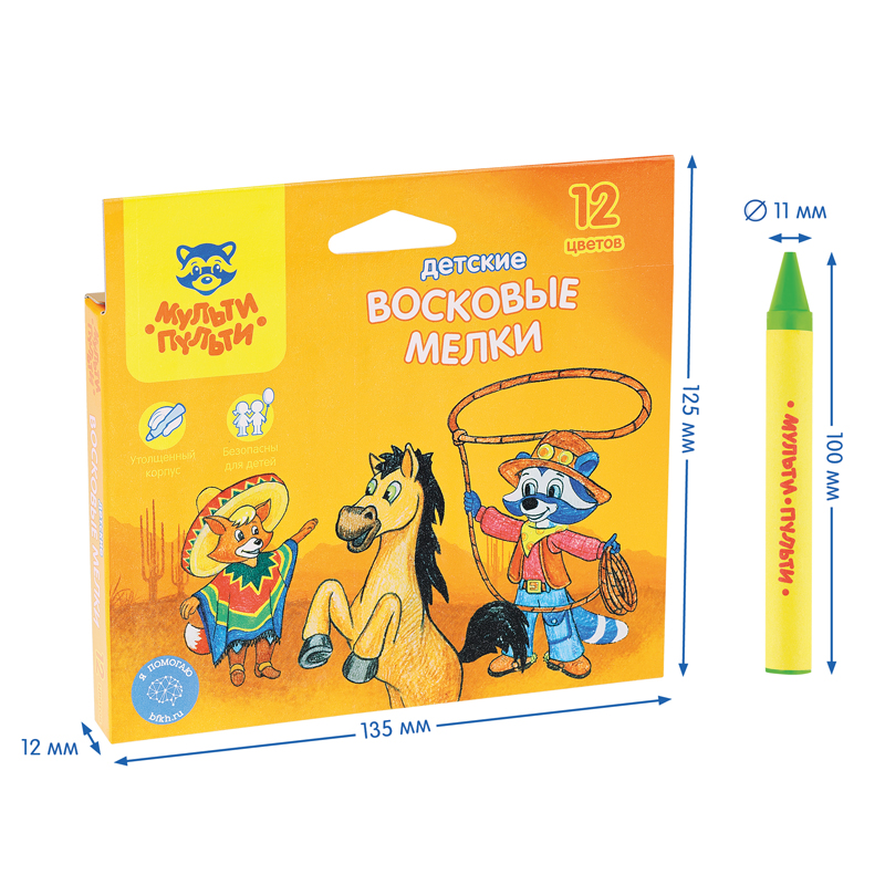 Набор из 12 круглых восковых мелков «Мульти-Пульти» серии «Енот в Мексике» подойдет для детского творчества. Длина мелка —100 мм, а диаметр составляет 11 мм. В наборе 12 цветов: оранжевый, жёлтый, коричневый, розовый, синий, красный, светло-коричневый, зелёный, фиолетовый, светло-зелёный, голубой, чёрный. Каждый мелок имеет бумажную обёртку.<br/>Мелки утолщённой формы на восковой основе легко наносятся на бумагу, картон, дерево и керамику. Подходят для детей старше 3-х лет.<br/>Упакованы в яркую картонную коробку, которая обязательно понравится ребёнку. Не требуют особых условий транспортировки и хранения.<br/>• Длина мелка — 100 мм<br/>• Диаметр мелка: 11 мм
