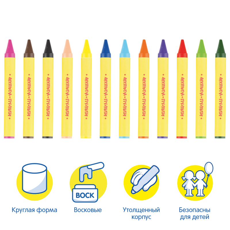 Набор из 12 круглых восковых мелков «Мульти-Пульти» серии «Енот в Мексике» подойдет для детского творчества. Длина мелка —100 мм, а диаметр составляет 11 мм. В наборе 12 цветов: оранжевый, жёлтый, коричневый, розовый, синий, красный, светло-коричневый, зелёный, фиолетовый, светло-зелёный, голубой, чёрный. Каждый мелок имеет бумажную обёртку.