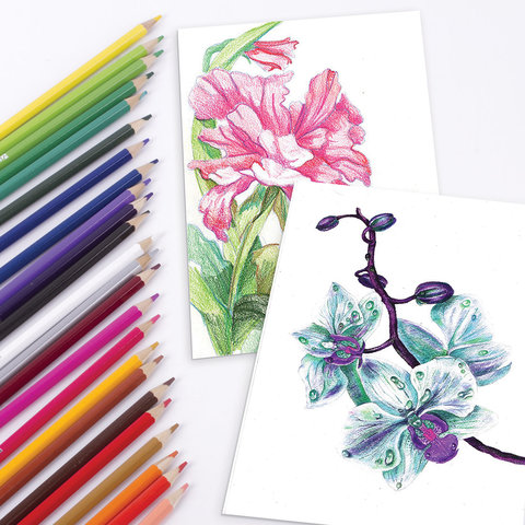Совмещают в себе свойства цветного карандаша и акварельных красок. Высокое качество грифеля с абсолютной чистотой палитры гарантирует равномерную насыщенность цвета по всей поверхности и легкую растворимость в воде.