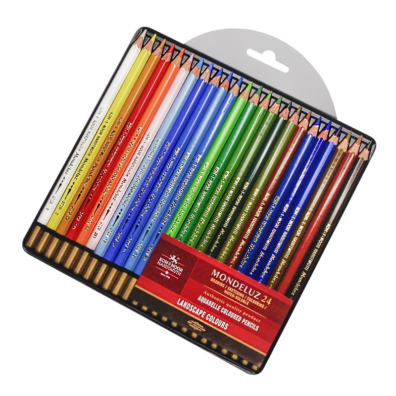 Художественные акварельные карандаши, очень мягкие и яркие. Размываются водой при помощи кисти. Смешиваемость до 6 слоев, хорошая светостойкость. Подходят профессионалам и любителям.На каждом карандаше указан номер цвета, по которому можно приобретать карандаши отдельно. Легко точатся обычной точилкой. В наборе подобраны карандаши для рисования пейзажей, которые упакованы в блистер в открытой металлической коробке, благодаря чему вся палитра видна при покупке.