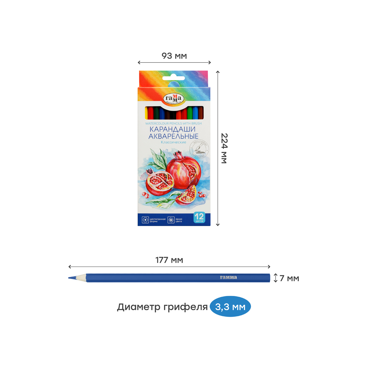 Цветные акварельные карандаши ГАММА серии «Классическая» созданы специально для детей, которые уже чувствуют себя настоящими художниками. В наборе 12 ярких и насыщенных цветов: зелёный, красный, бордовый, синий, жёлтый, чёрный, коричневый, голубой, фиолетовый, оранжевый, салатовый, красно-коричневый. Увеличенный диаметр грифеля – 3,3 мм. Акварельные карандаши «Классические» обладают свойствами цветных карандашей и акварели. Благодаря водорастворимому связующему в составе они отличаются хорошей размываемостью. Тонкотертые пигменты обеспечивают чистые, насыщенные и равномерные цвета. Шестигранный корпус карандаша диаметром 7 мм и длиной 174 мм изготовлен из древесины специальной обработки, и его легко точить. В комплекте – высококачественная кисть «ГАММА» из синтетического волоса. Представлены в удобной упаковке в креативном дизайне.<br/>• Количество цветов: 12;<br/>• Форма корпуса: шестигранная;<br/>• Заточка грифеля: да.<br/>• Количество карандашей: 12.