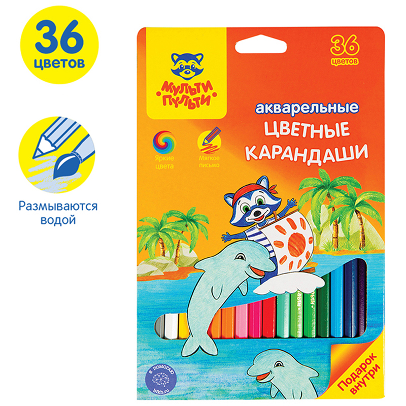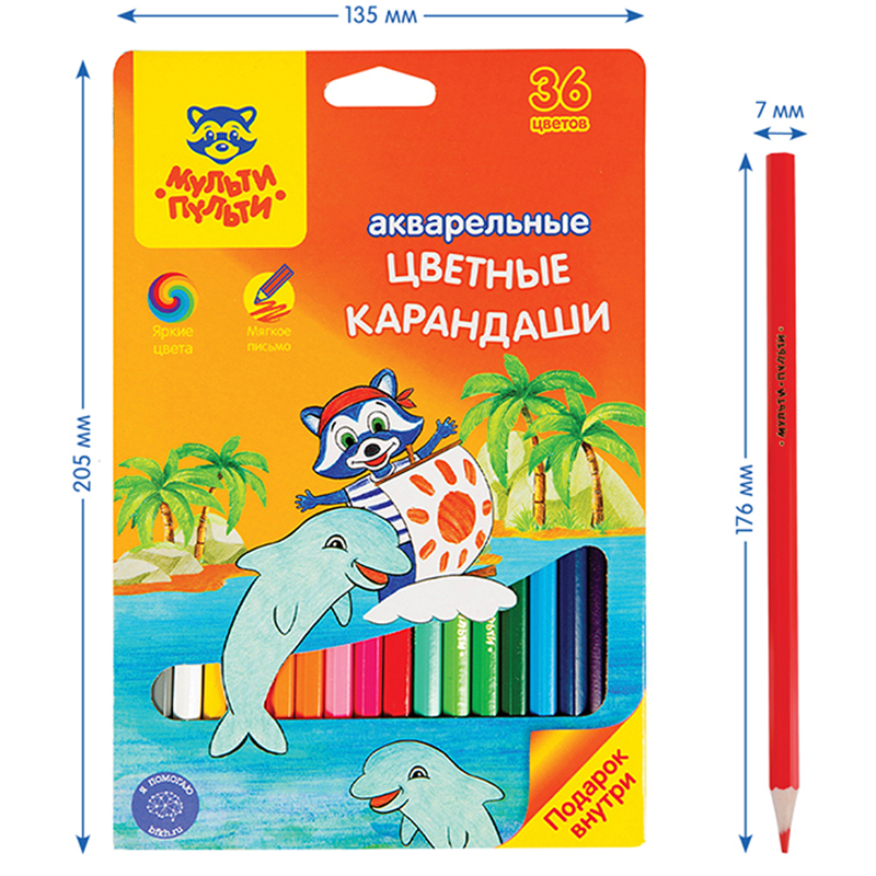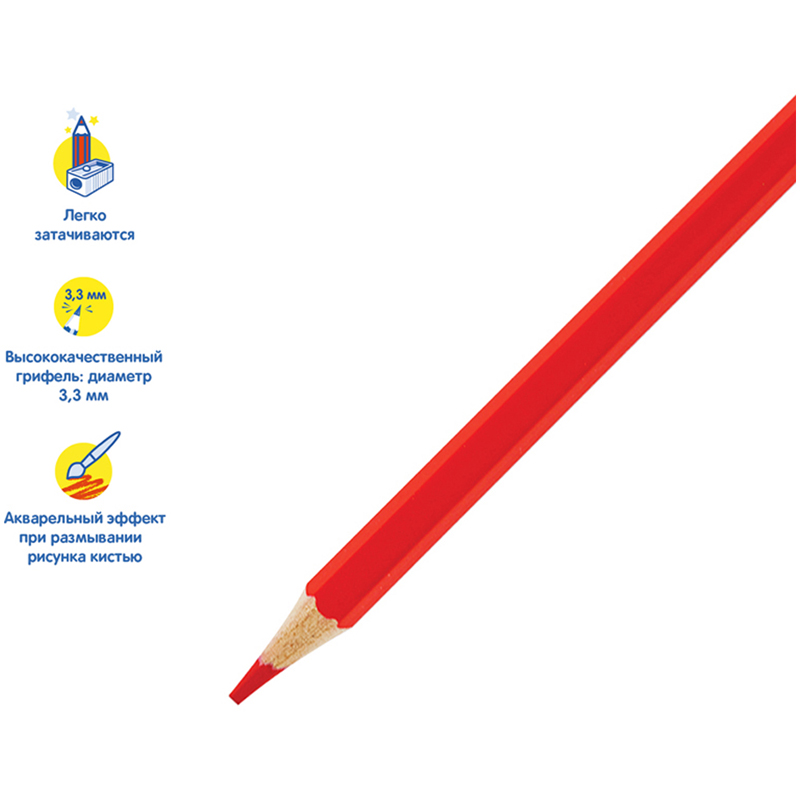 Карандаши цветные с заточенным грифелем. Грифель диаметром 3,3мм. Яркие насыщенные цвета. Штрихи мягко ложатся на бумагу. Обладают эффектом акварельных красок - нанесенный на бумагу рисунок можно размыть влажной кистью. Карандаши легко затачиваются. Упакованы в картонную лакированную коробку со склеенным европодвесом. Для детей старше 3-х лет. В наборе 36 цветов (красный, темно-красный, светло-красный, алый, ярко-оранжевый, темно-оранжевый, оранжевый, светло-оранжевый, желтый, ярко-розовый, розовый, фуксия, темно-фиолетовый, ярко-фиолетовый, фиолетовый, светло-фиолетовый, темно-синий, синий, светло-синий, лазурный, голубой, светло-голубой, сепия, темно-коричневый, коричневый, светло-коричневый, темно-зеленый, зеленый, бирюзовый, изумрудный, ярко-зеленый, светло-зеленый, черный, темно-серый, серый, белый).