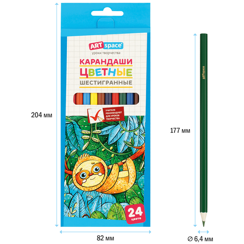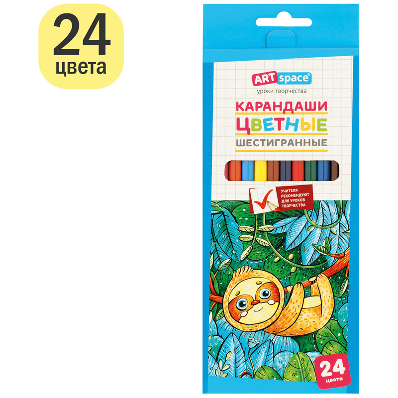 Цветные карандаши ArtSpace «Милые зверушки» с удобным, тонким шестигранным корпусом представлены в наборе из 24 цветов с уже заточенным мягким грифелем. Деревянные карандаши имеют яркие оттенки и легко затачиваются. Диаметр корпуса: 6,4 мм, диаметр грифеля: 2,65 мм, длина: 177 мм. <br/>Карандаши упакованы в картонную коробку с петлёй-европодвесом.<br/>• Количество цветов: 24;<br/>• Форма корпуса: шестигранная;<br/>• Заточка грифеля: есть.