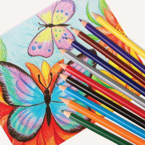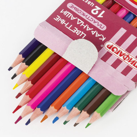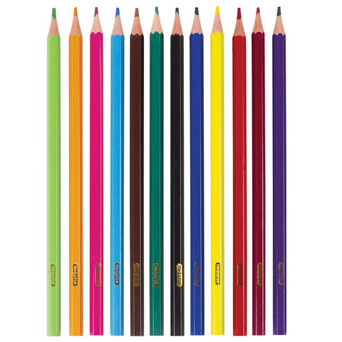 Набор состоит из 12 цветов: розовый, красный, желтый, оранжевый, салатовый, зеленый, голубой, синий, фиолетовый, коричневый, серый, черный. Шестигранная форма сечения корпуса позволяет карандашу не скатываться с поверхности стола во время занятий рисованием. Карандаши изготовлены из пластика и имеют лакированный корпус, который при разломе не образует острые края и безопасен для детей. Легко затачиваются. Грифель диаметром 2,65 мм обладает повышенной прочностью. Все карандаши заточены и поставляются в картонной упаковке с европодвесом.
