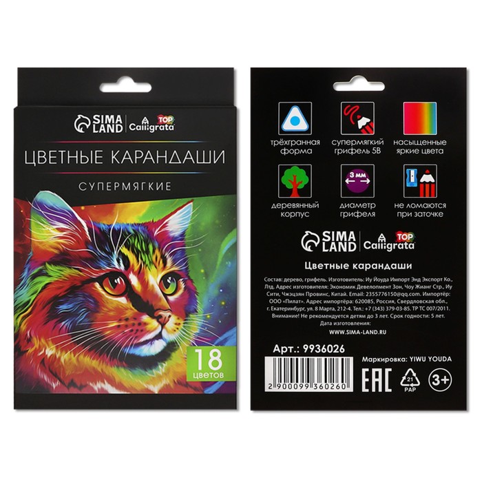 Карандаши 18 цветов в картонной коробке, шестигранные, деревянные,Цветы на чёрном МИКС