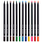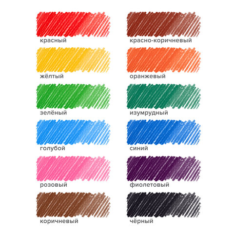 Набор состоит из 12 цветов: красный, оранжевый, желтый, бледно-зеленый, темно-зеленый, голубой, синий, фиолетовый, сиреневый, бледно-коричневый, коричневый, черный. Наконечник дублирует цвет стержня.