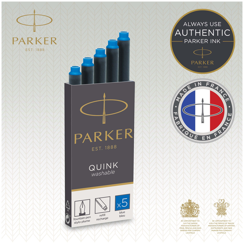 Чернильные картриджи Parker Cartridge Quink подходят для использования в перьевых ручках. Они позволяют легко и просто заправить ручку, при этом не испачкавшись. Смываемые чернила синего цвета. В блистере 5 картриджей.<br/>• Цвет чернил: синий;<br/>• Количество: 5 штук.