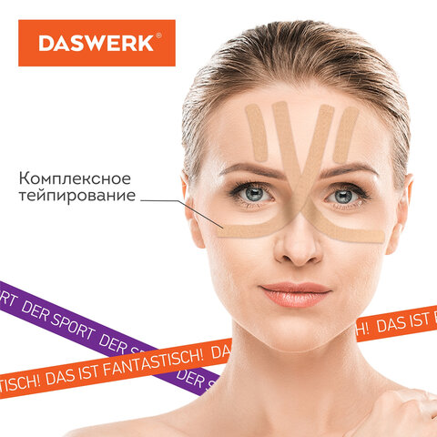 Кинезио тейпы DASWERK подходят для тейпирования лица. В эстетической косметологии используются для лифтинга овала лица, разглаживания возрастных и мимических морщин, восстановления эластичности кожи, улучшения микроциркуляции и кровоснабжения кожи лица.