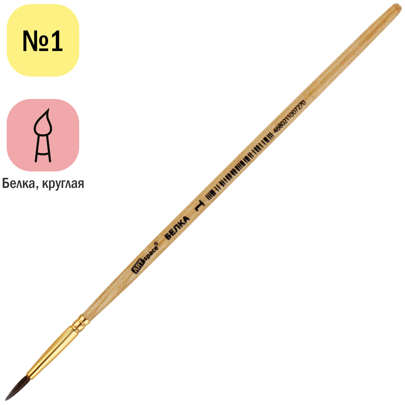 Художественные кисти ArtSpace изготовлены из натурального волоса белки. Подходят для начальных уроков рисования. Кисть круглой формы с короткой ручкой из дерева предназначены для работы с акварельными красками. Эластичный, мягкий волос прекрасно сохраняет форму пучка. Специальные технологии обработки повышают его упругость. Кисть позволяет создавать точнкие линии благодаря способности волосков плотно прилегать друг к другу во влажной среде.<br/>• Волос: белка; <br/>• Номер: 1;<br/>• Форма кисти: круглая;<br/>• Тип ручки: короткая;<br/>• Материал ручки: дерево.
