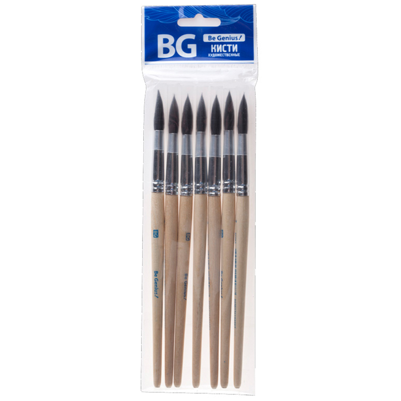 Художественные кисти BG изготовлены из натурального ворса белки в круглой форме. Номер кисти – 7. Она прекрасно удерживает краску, а мягкий волос сохраняет форму пучка и позволяет наносить штрихи. Короткая ручка выполнена из натурального необработанного дерева.<br/>• Номер: 7;<br/>• Форма кисти: круглая;<br/>• Волос: белка;<br/>• Тип ручки: короткая.