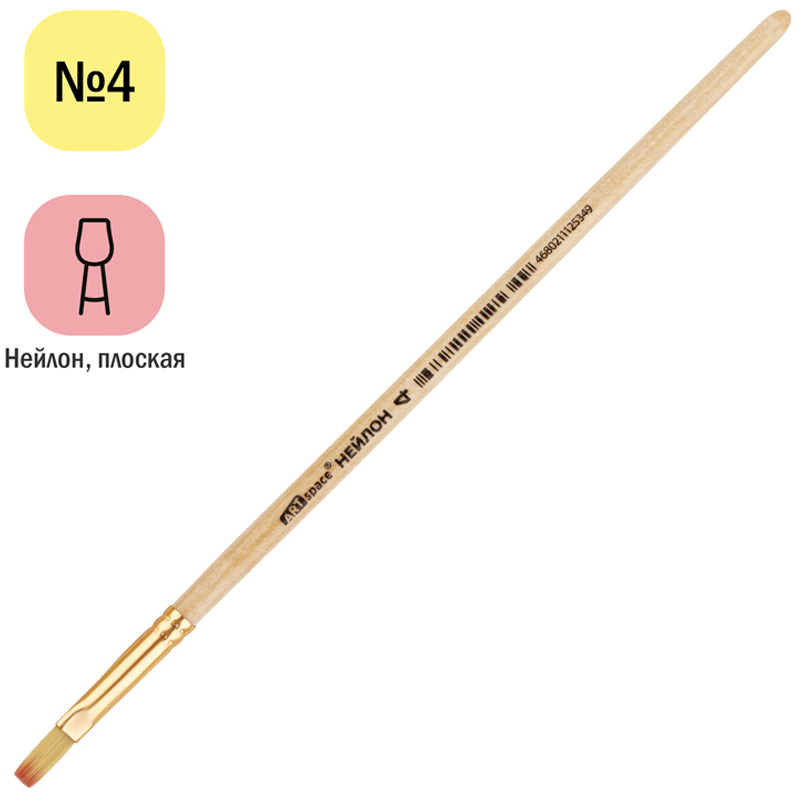 Художественная кисть ArtSpace из нейлона - это недорогой вариант для школьников, где редко пользуются акрилом и маслом, чаще гуашью и акварелью. Она идеальна для начинающих художников, поэтому их часто используют в детских образовательных учреждениях. Кисть плоской формы с короткой ручкой из дерева также подходит для малышей. <br/>• Волос: нейлон; <br/>• Номер: 4;<br/>• Форма кисти: плоская;<br/>• Тип ручки: короткая;<br/>• Материал ручки: дерево.
