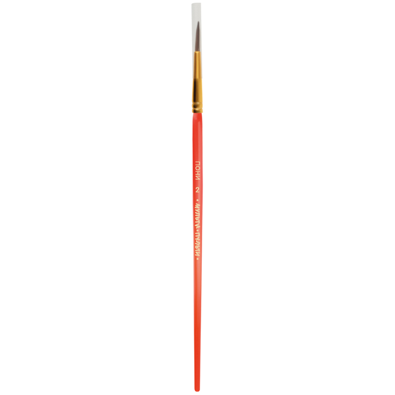 Кисть круглая № 2 «Мульти-Пульти» предназначена для детей с начальным и средним уровнем подготовки. Используемый натуральный волос пони обладает капиллярным эффектом, поэтому кисть можно использовать в том числе для акварельных красок. Форма обоймы − круглая.