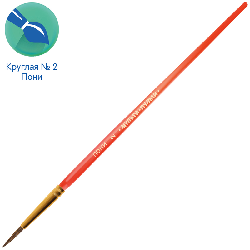 Кисть круглая № 2 «Мульти-Пульти» предназначена для детей с начальным и средним уровнем подготовки. Используемый натуральный волос пони обладает капиллярным эффектом, поэтому кисть можно использовать в том числе для акварельных красок. Форма обоймы − круглая.<br/>Необычная прозрачная пластиковая ручка не боится воды и легко моется. Кисть имеет двойной обжим обоймы и надежное клеевое скрепление с корпусом ручки.<br/>• Номер: 2;<br/>• Форма кисти: круглая;<br/>• Волос: пони.