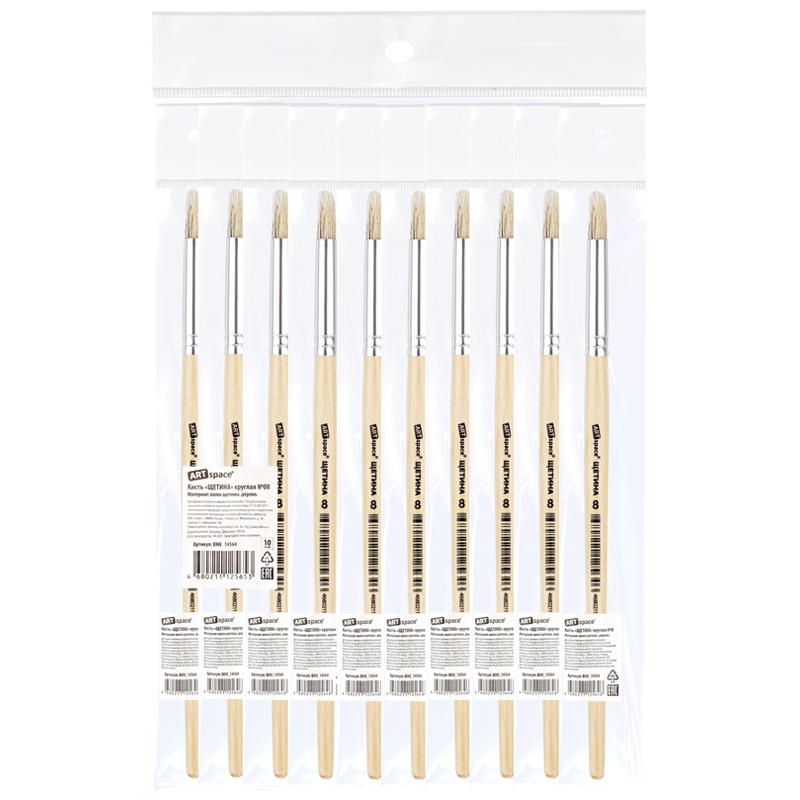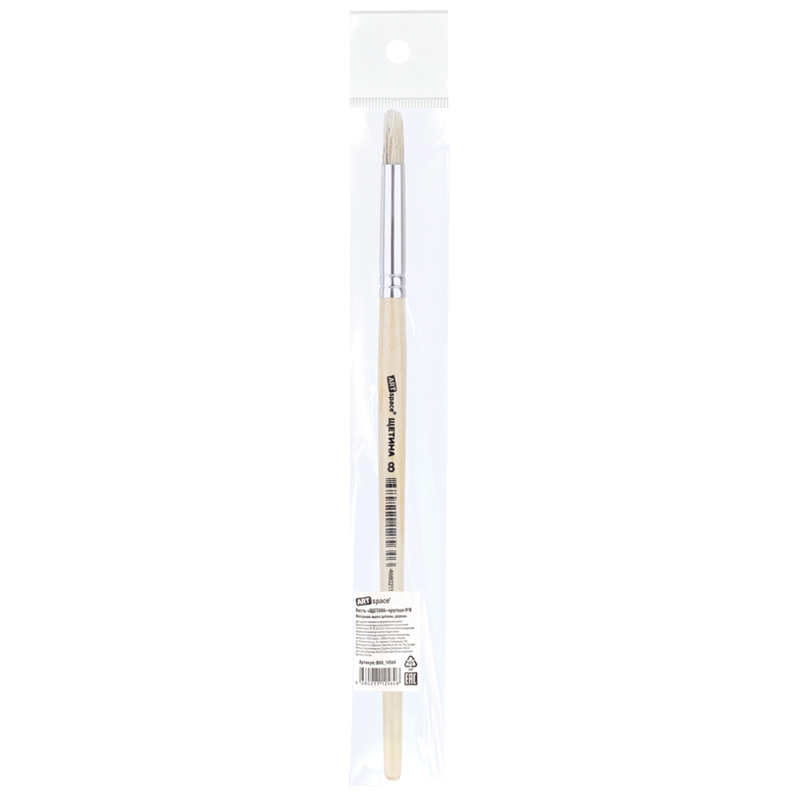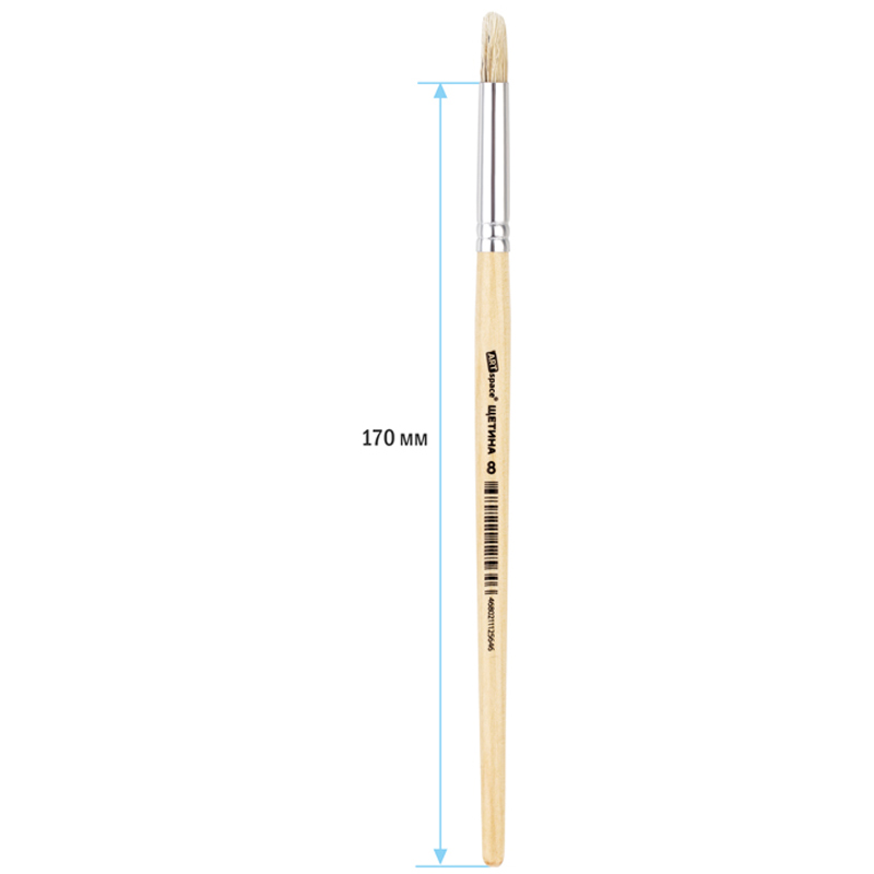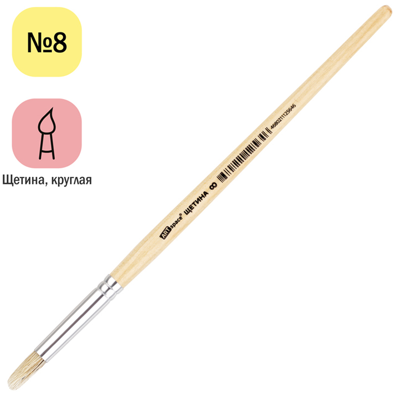 Художественные кисти ArtSpace изготовлены из качественной щетины. Изделие даже после продолжительного использования не теряет форму. Ещё одним важным свойством является расщеплённый кончик, который способствует хорошей наполняемости кисти и ровному нанесению краски. Кисть круглой формы с короткой ручкой из дерева предназначена для работ с «тяжёлыми красками»: маслом, акрилом, темперой, гуашью. Натуральные кисти из щетины - отличный инструмент как для детского и школьного творчества, так для хобби и профессиональной живописи. Ручка кисти изготовлена из берёзы и покрыта глянцевым лаком. <br/><br/>• Волос: щетина; <br/>• Номер: 8;<br/>• Форма кисти: круглая;<br/>• Тип ручки: короткая;<br/>• Материал ручки: дерево.
