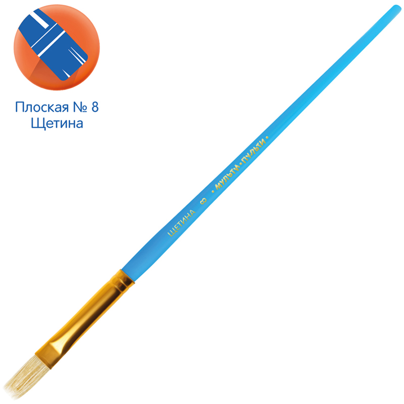 Кисть круглая № 8 «Мульти-Пульти» предназначена для детей с начальным и средним уровнем подготовки. Волос щетины подходит для работы с плотными и тяжелыми красками, также может использоваться для работ с клеем в аппликациях. Форма обоймы − плоская.