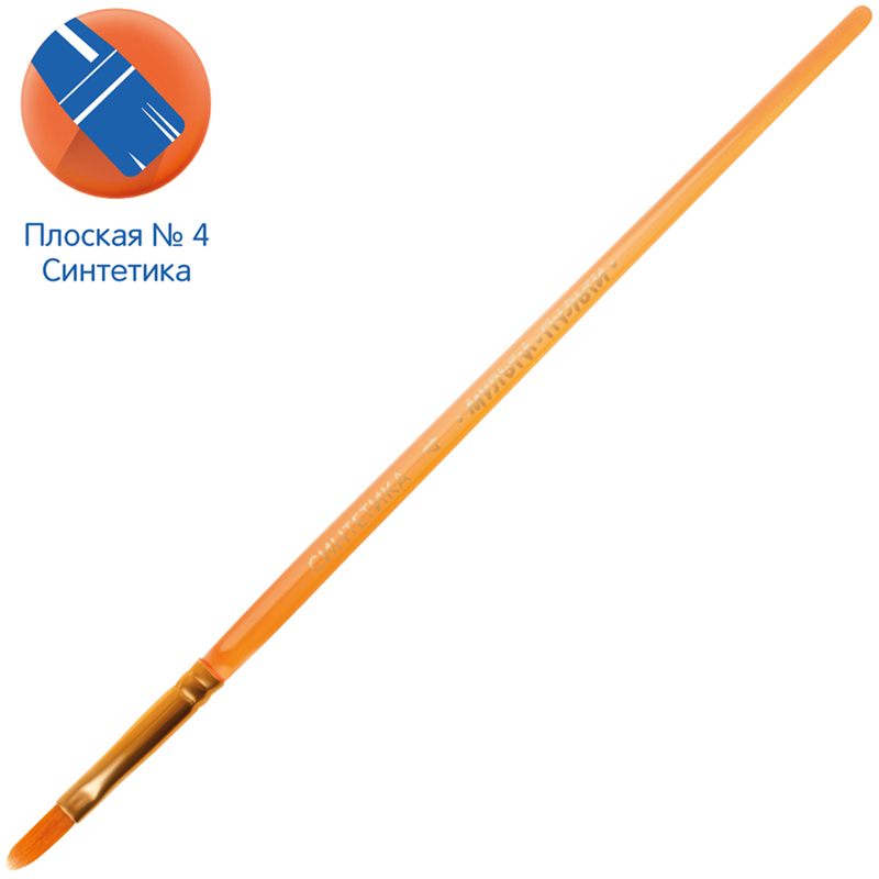 Кисть плоская № 4 «Мульти-Пульти» предназначена для детей с начальным и средним уровнем подготовки. Используемый синтетический волос обладает капиллярным эффектом, поэтому кисть можно использовать в том числе для акварельных красок. Форма обоймы − плоская.