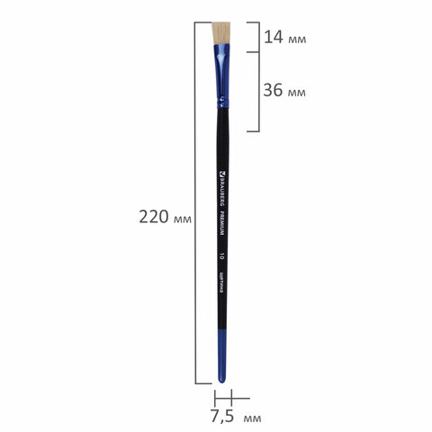 Кисть с плоской формой пучка № 10 позволит прорисовывать детали и наносить крупные мазки и линии. Пучок из щетины обладает высокой упругостью, хорошо держит форму. Ручка из древесины покрыта лаком, что защищает ее от воздействия красок и влаги – кисть долговечна и надежна. Номер кисти соответствует реальной ширине пучка в миллиметрах.