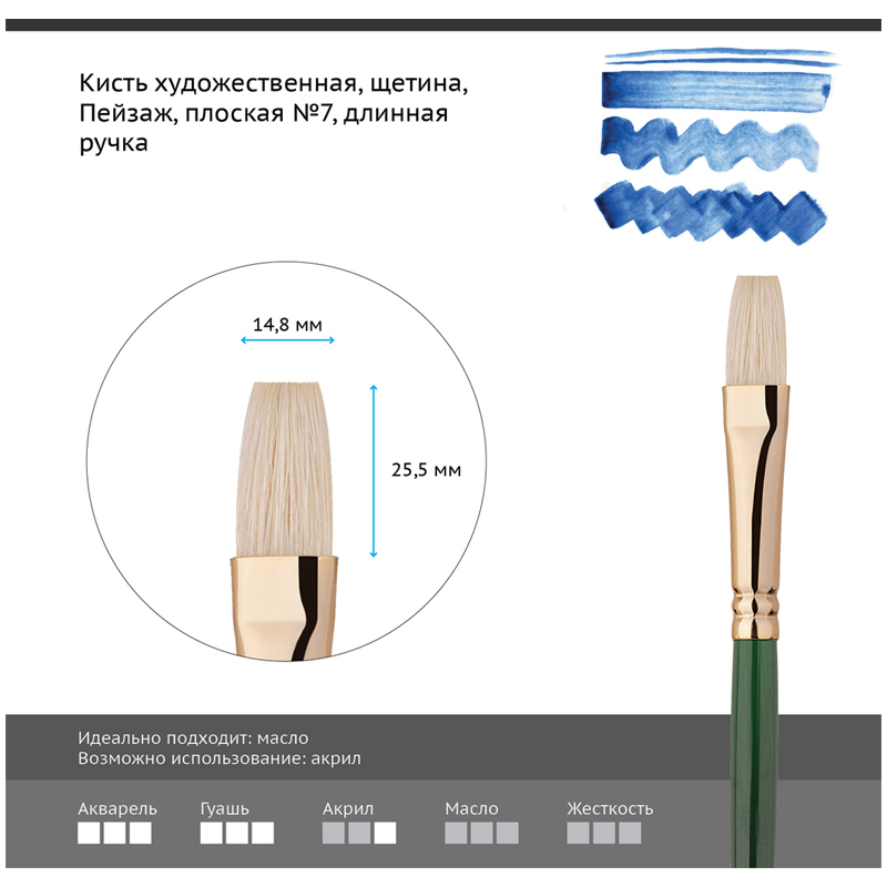 Художественные кисти ГАММА серии «Пейзаж» изготавливаются из отбелённой и очищенной специальными химическими реагентами щетины. Кисть даже после продолжительного использования не теряет свою форму. В пучке преобладают волоски с расщеплённым кончиком, поэтому кисть хорошо наполняется краской и хорошо её отдаёт. Упругий и прочный свиной волос отлично подходит для работы с тяжёлыми масляными и акриловыми красками. Щетина износоустойчива к сильным растворителям. Длинная ручка кисти покрыта глянцевым лаком изумрудного цвета. Кисть имеет никелированную бесшовную обойму и цветную лакированную ручку.<br/>• Номер: 7;<br/>• Форма кисти: плоская;<br/>• Волос: щетина;<br/>• Тип ручки: длинная;<br/>• Ширина волосяного пучка: 14,8;<br/>• Выставка: 25,5.
