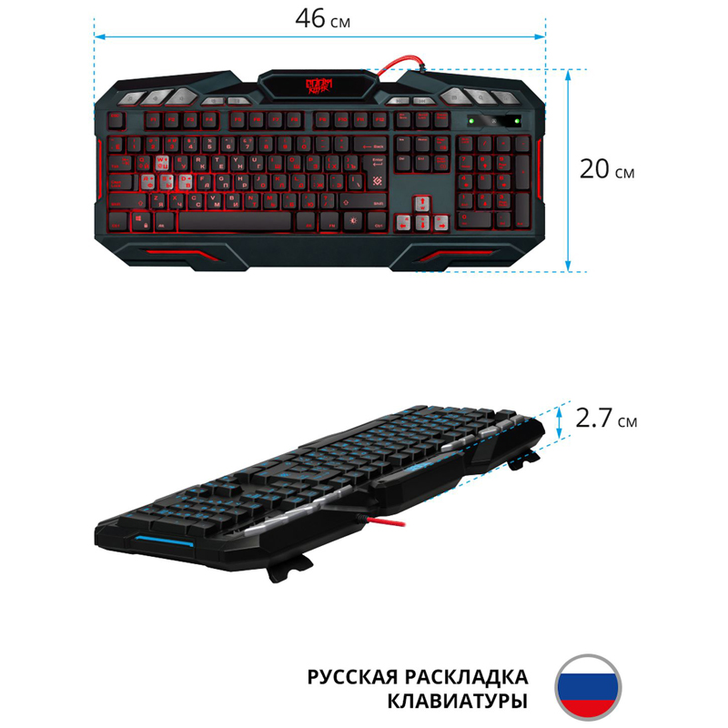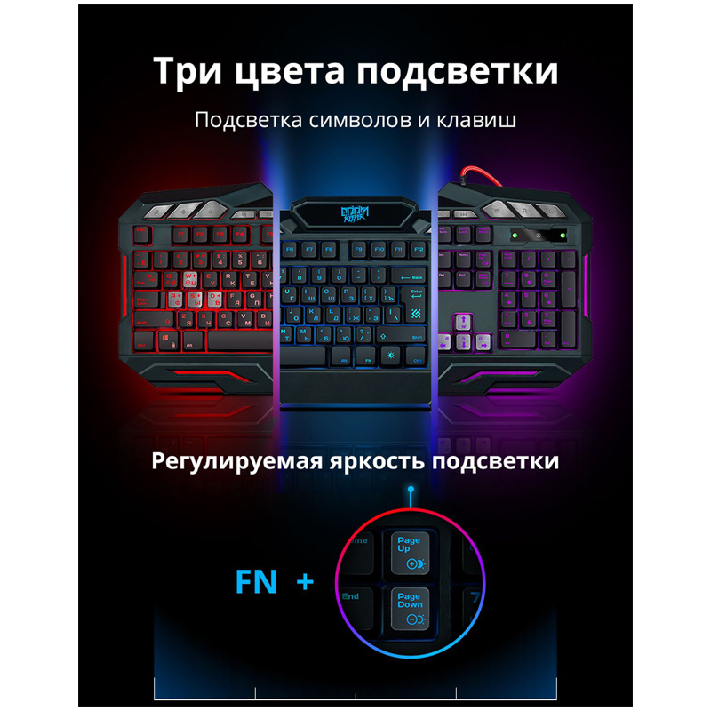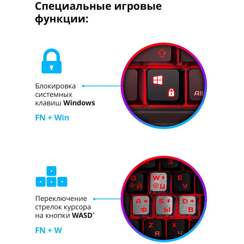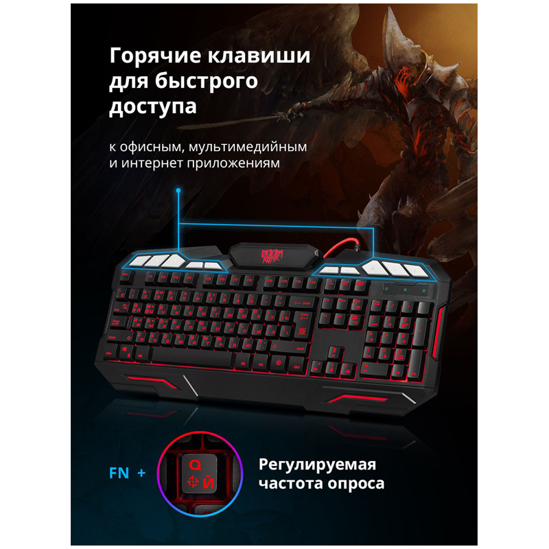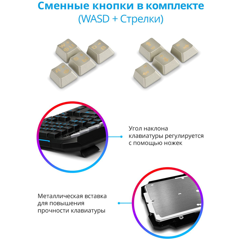 Специальные игровые функции: блокировка системных клавиш Windows и переключение стрелок курсора на кнопки WASD*. Распознает одновременное нажатие клавиш. 3 цвета подсветки. Горячие клавиши для быстрого доступа к различным приложениям. Подсветка символов и клавиш. Регулируемая яркость подсветки. Металлическое дно повышает прочность клавиатуры. Ферритовый фильтр помех. Плетеная структура кабеля. Позолоченный USB-коннектор. Влагоустойчивая конструкция клавиатуры. Возможность выбора одного цвета подсветки. Сменные кнопки (WASD + Стрелки) в комплекте