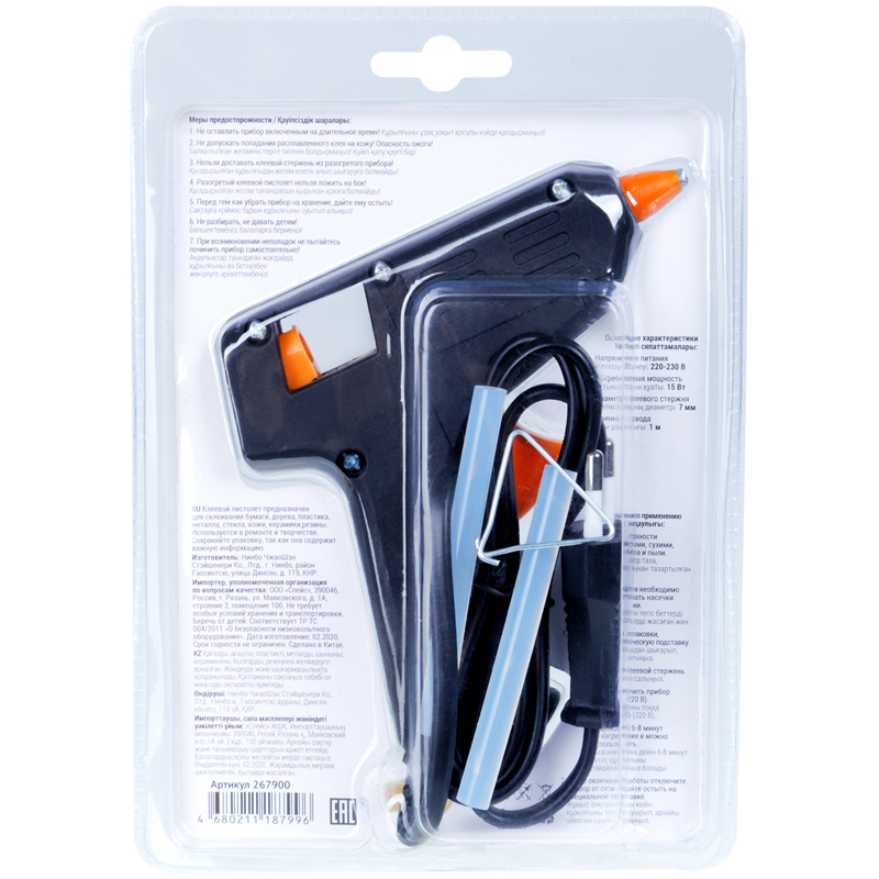Пистолет клеевой 15 Вт малый (в блистере) предназначен для прочной фиксации поверхностей с помощью расплавленной клеевой массы. Заправляется он специальным клеевым стержнем диаметром 7 мм. Корпус клеевого пистолета изготовлен из ударопрочной пластмассы и имеет скобу для надежной установки в нерабочем положении. Принцип работы: клеевой стержень плавится в металлической камере с помощью нагревательного устройства и для точного дозирования при нажатии на курок подаётся из сопла на склеиваемую поверхность. С его помощью вы сможете склеить: дерево, пластик, резину, кожу, стекло, металлы (их лучше перед работой разогревать феном), ткань, пенопласт, керамику, картон, бумагу, цветы или что-то другое. Используется малый клеевой пистолет в основном в быту, там где нужно что-то подклеить в не большом объеме: для декорирования, изготовления упаковочной и сувенирной продукции. Удобен для работы с малогабаритными изделиями. Клеевой стержень в комплекте.